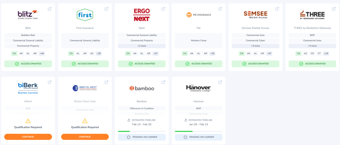 - Pending: If the status is "Pending," it means that you have already requested this carrier, and your access is currently pending. Each carrier will show you an estimated timeline to when your access will be granted! Please make sure to check your inbox regularly for any emails from us, as each carrier has a unique process, and instructions will be provided there.